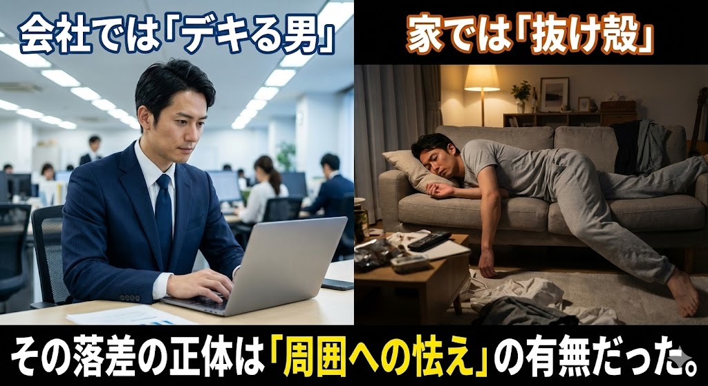 家でパフォーマンスが落ちるのは、あなたが「自制心のない人間」だからではありません。あなたが、職場という緊張状態の中で、過度な「怯え」を燃料として高性能に稼働しすぎていたからです。家でダラダラしてしまうのは、あなたが外で頑張りすぎたことの自然な反動です。戦場から帰還し、安全地帯で休んでいる状態を「怠惰」と呼ぶのは酷です。
